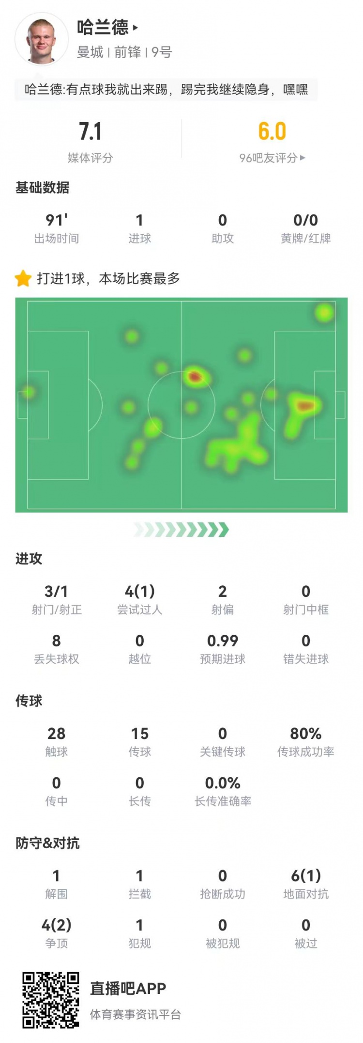 3月16日訊 曼城在本輪英超2-2戰(zhàn)平布萊頓,哈蘭德本場(chǎng)數(shù)據(jù)如下: