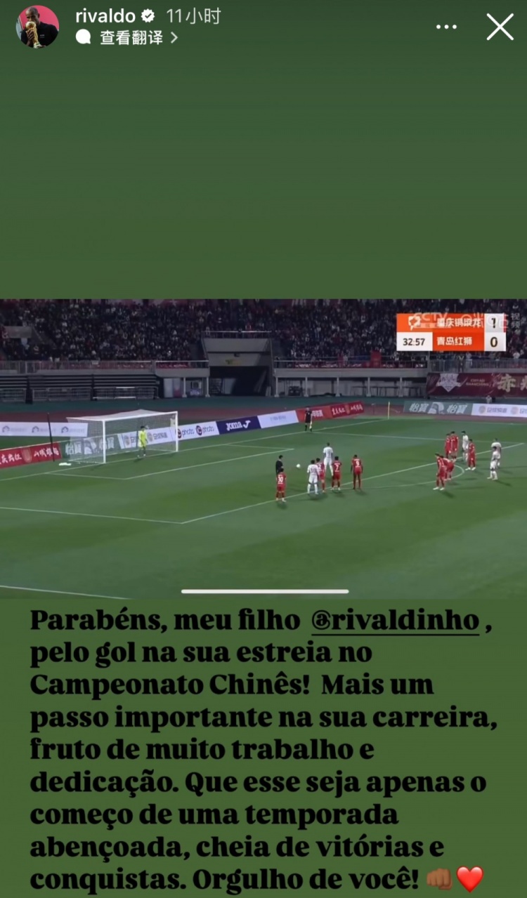 賽后,里瓦爾多在社媒曬出了兒子的進球視頻并配文祝賀寫道: