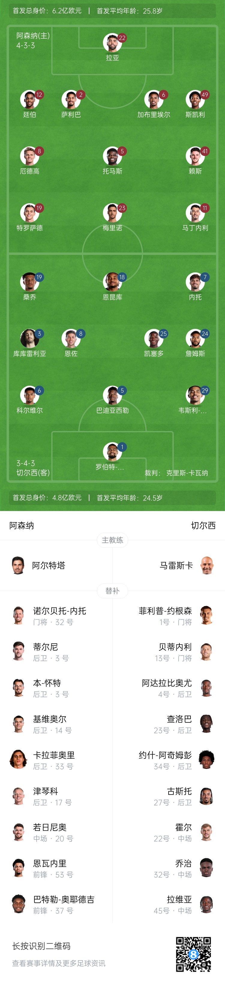 阿森納首發(fā):22-拉亞、12-廷伯、2-薩利巴、6-加布里埃爾、49-斯凱利、5-托馬斯、41-賴斯、8-厄德高、11-馬丁內(nèi)利、19-特羅薩德、23-梅里諾