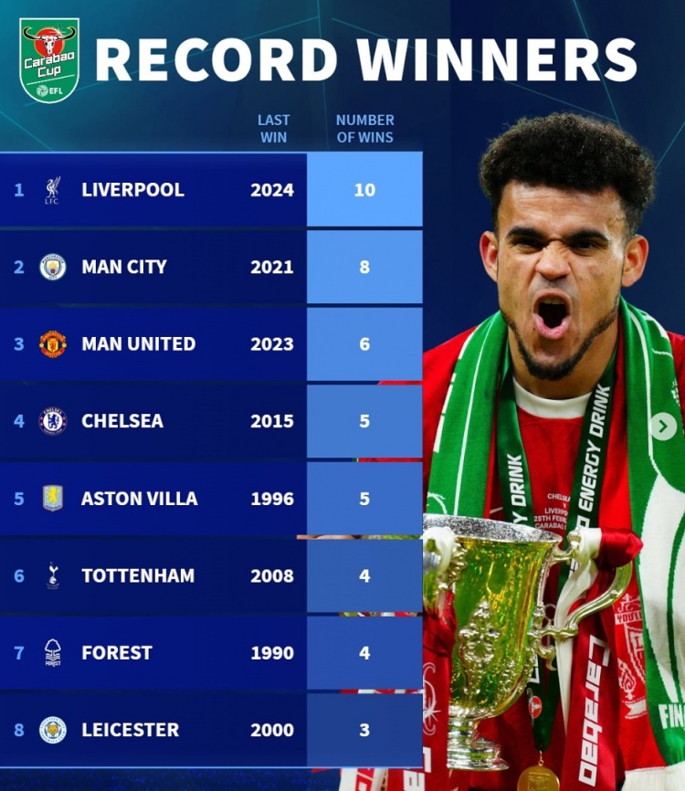 3月16日訊 利物浦即將迎來(lái)同紐卡的聯(lián)賽杯決賽,官方數(shù)據(jù)統(tǒng)計(jì)顯示總計(jì)有23支不同的俱樂(lè)部在迄今為止舉行的61屆聯(lián)賽杯決賽中奪得冠軍,紅軍是該項(xiàng)賽事奪冠次數(shù)最多的球隊(duì)。