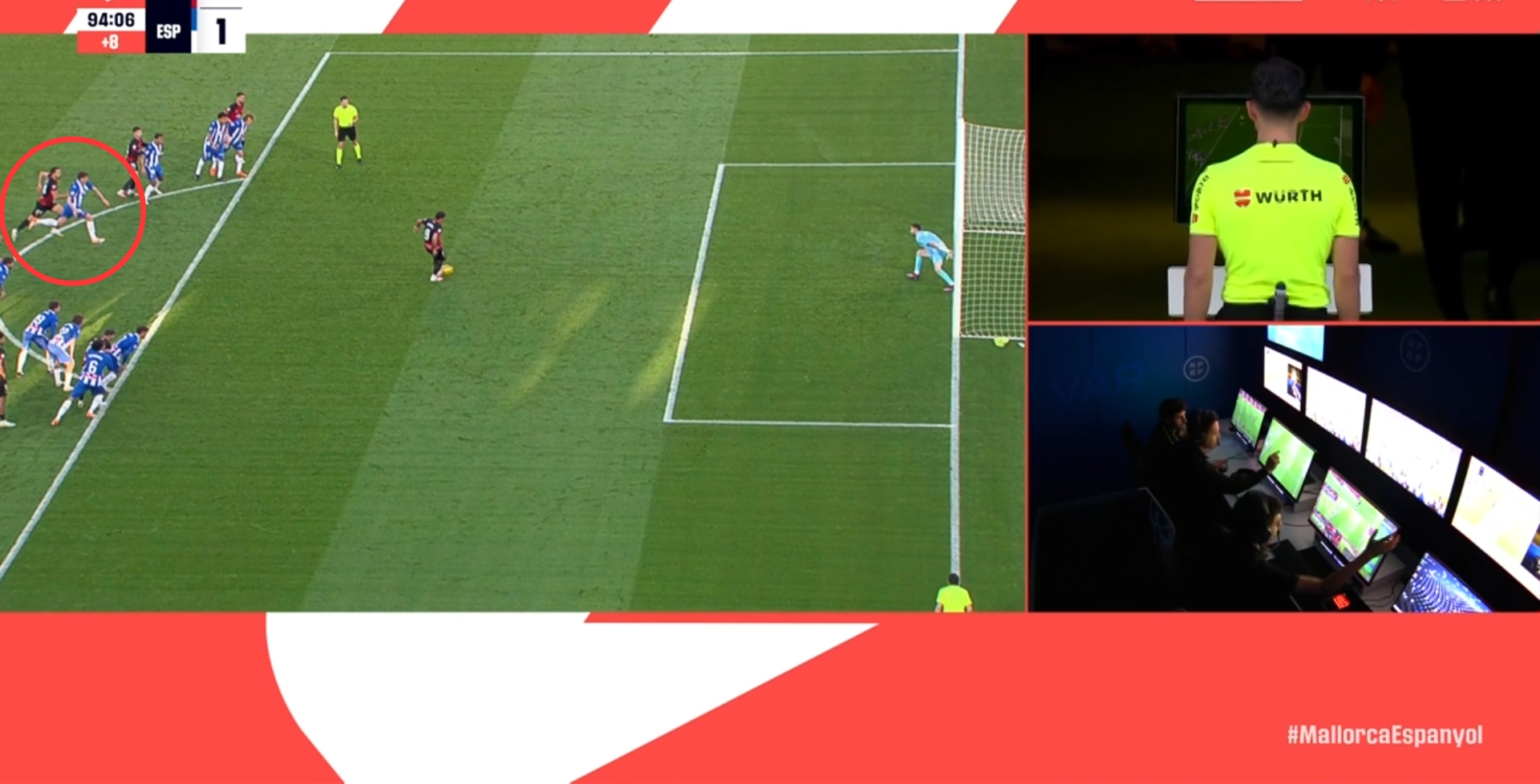 第92分鐘,VAR介入,主裁親自查看回放,此前西班牙人球員和馬略卡球員同時(shí)提前進(jìn)入禁區(qū)弧(距離點(diǎn)球點(diǎn)不滿9.15米),并對比賽產(chǎn)生影響,主裁判罰點(diǎn)球重罰↓