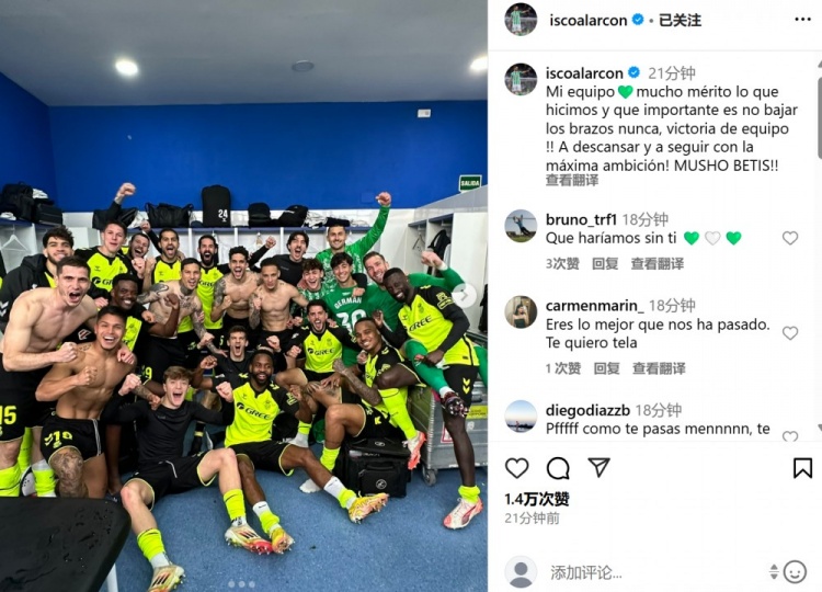 本場(chǎng)比賽伊斯科點(diǎn)射破門(mén)拉響反擊號(hào)角,賽后伊斯科也在社媒曬出更衣室內(nèi)全隊(duì)球員慶祝合影,配文寫(xiě)道:“我的球隊(duì)????我們做到的事情值得被認(rèn)可,永不放棄太重要了。這是一場(chǎng)團(tuán)隊(duì)的勝利,現(xiàn)在是時(shí)候休息調(diào)整,以最高昂的斗志繼續(xù)前進(jìn)。貝蒂斯加油!”