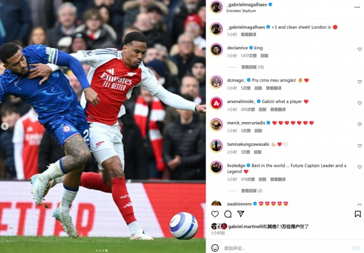 3月17日訊 在本輪英超,阿森納1-0擊敗切爾西。本場(chǎng)比賽加布里埃爾發(fā)揮出色,賽后當(dāng)選英超官方球迷票選全場(chǎng)最佳,賽后他也在社媒曬出本場(chǎng)與里斯-詹姆斯對(duì)抗照片,配文寫(xiě)道:“拿下三分并完成零封,倫敦是紅色的!” 本文標(biāo)簽: 足球 英超 阿森納