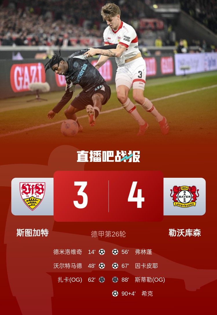 神奇劇本!勒沃庫森連追3球4-3斯圖加特落后拜仁6分 ??搜a(bǔ)時絕殺