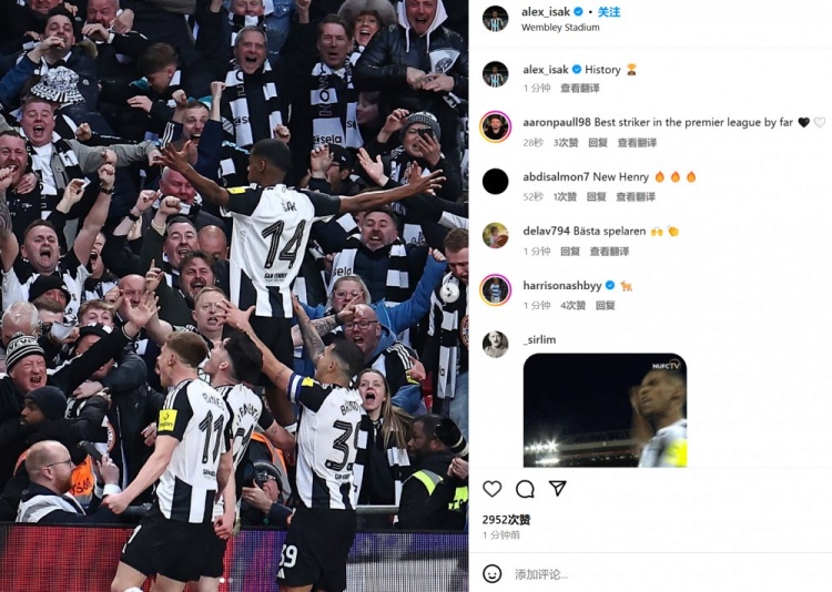 3月17日訊 紐卡在聯(lián)賽杯決賽2-1擊敗利物浦,時隔70年再次奪冠,進(jìn)球功臣伊薩克也在賽后通過社媒慶祝。