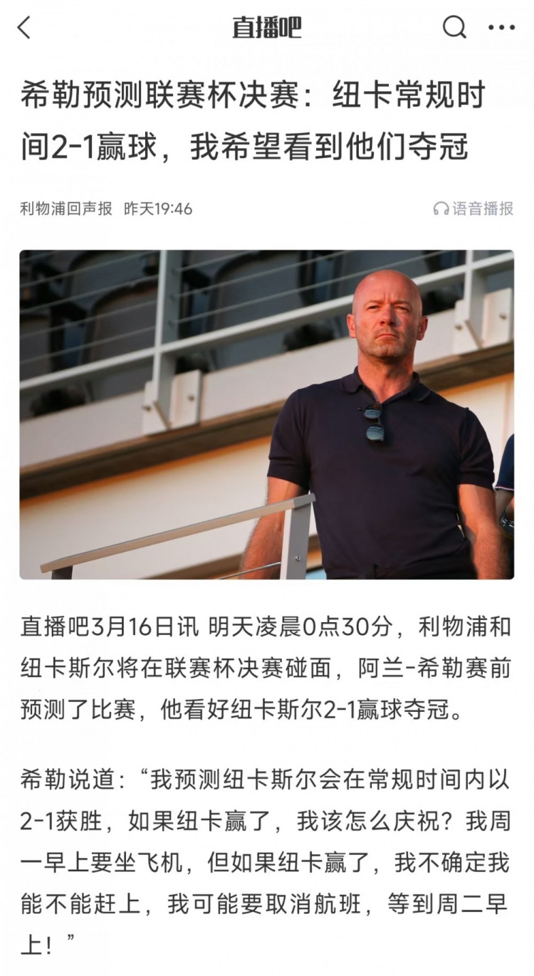 賽前,紐卡斯?fàn)柮薨⑻m-希勒在預(yù)測(cè)比賽時(shí)就準(zhǔn)確命中了比分,希勒當(dāng)時(shí)說(shuō)道:“我預(yù)測(cè)紐卡斯?fàn)枙?huì)在常規(guī)時(shí)間內(nèi)以2-1獲勝,如果紐卡贏了,我該怎么慶祝?我周一早上要坐飛機(jī),但如果紐卡贏了,我不確定我能不能趕上,我可能要取消航班,等到周二早上!”