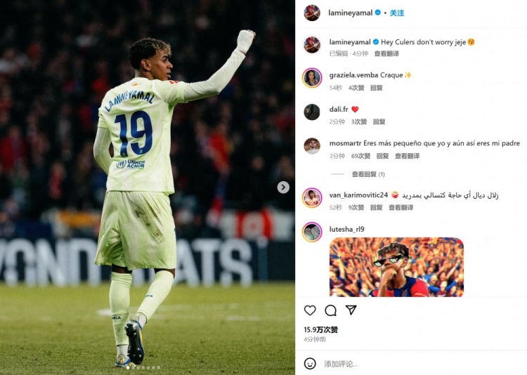 3月17日訊 巴薩在本輪西甲4-2逆轉馬競,亞馬爾補時打進關鍵反超球。第90+2分鐘,佩德里橫傳,亞馬爾外圍擺脫后勁射,皮球直掛網窩死角。數(shù)據(jù)統(tǒng)計顯示,亞馬爾也就此結束了長達4個半月的西甲進球荒,他本人也通過社媒曬照慶祝:“嘿,巴薩球迷們,別擔心,哈哈????”。 本文標簽: 足球 西甲 巴塞羅那 馬德里競技