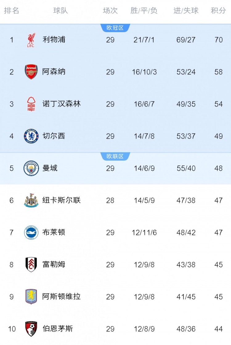 3月18日訊 數(shù)據(jù)機構(gòu)OPTA使用超級計算機預測了英超目前第3名之后球隊最終獲得前五名的概率,諾丁漢森林最被看好。諾丁漢森林:85.6%曼城:78.4%紐卡:52.3%切爾西:48.4%布萊頓:20.1%維拉:7.7%伯恩茅斯:5.3%富勒姆:1.7%英超積分榜前十: 本文標簽: 足球 英超 曼城 諾丁漢森林 伯恩茅斯 布萊頓 紐卡斯爾聯(lián) 切爾西 阿斯頓維拉 富勒姆