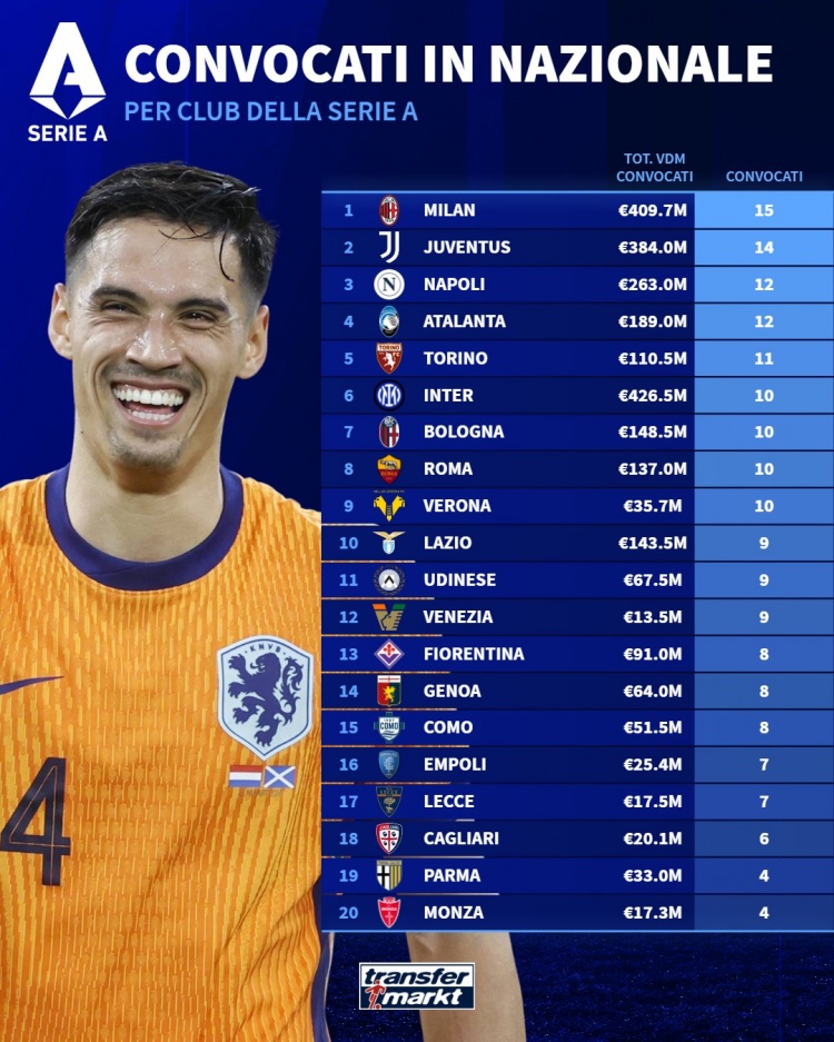 3月18日訊 德國(guó)轉(zhuǎn)會(huì)市場(chǎng)統(tǒng)計(jì)了意甲俱樂(lè)部被國(guó)家隊(duì)征召的球員人數(shù),并列出榜單,米蘭15人最多,尤文14人次席。