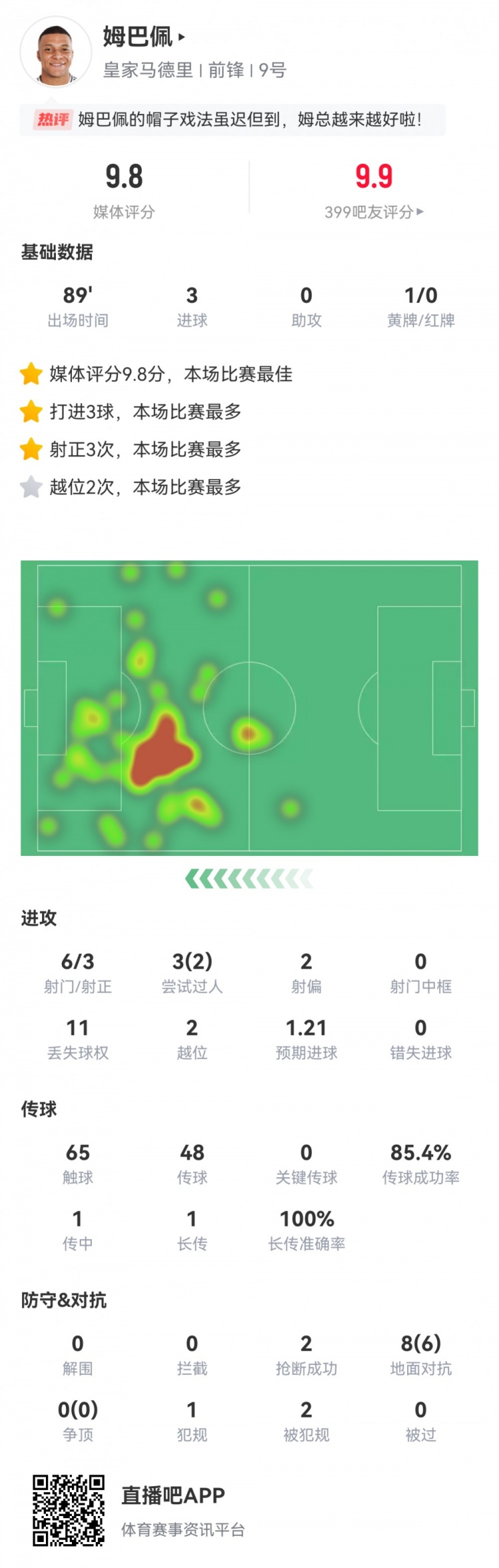 1月26日訊 本輪西甲,皇馬3-0客勝巴拉多利德,姆巴佩上演皇馬生涯首次帽子戲法。球員全場重點數(shù)據(jù)如下↓6射3正3粒進球3次過人成功2次11次丟失球權(quán)2次越位預(yù)期進球1.2165次觸球傳球成功率85.4%2次搶斷8次對抗成功6次全場最高9.8分 本文標(biāo)簽: 足球 姆巴佩 西甲 皇家馬德里