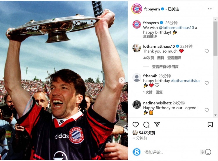 拜仁官方社媒曬出馬特烏斯效力球隊(duì)期間舉起德甲冠軍獎(jiǎng)盤(pán)的照片,配文:“我們祝馬特烏斯生日快樂(lè)!”