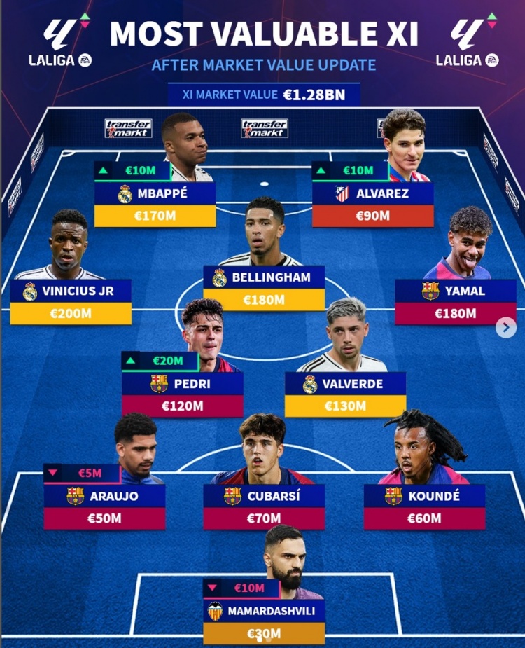 中場:維尼修斯(皇馬,2億)、佩德里(巴薩,1.2億)、貝林厄姆(皇馬,1.8億)、巴爾韋德(皇馬,1.3億)、亞馬爾(巴薩,1.8億)