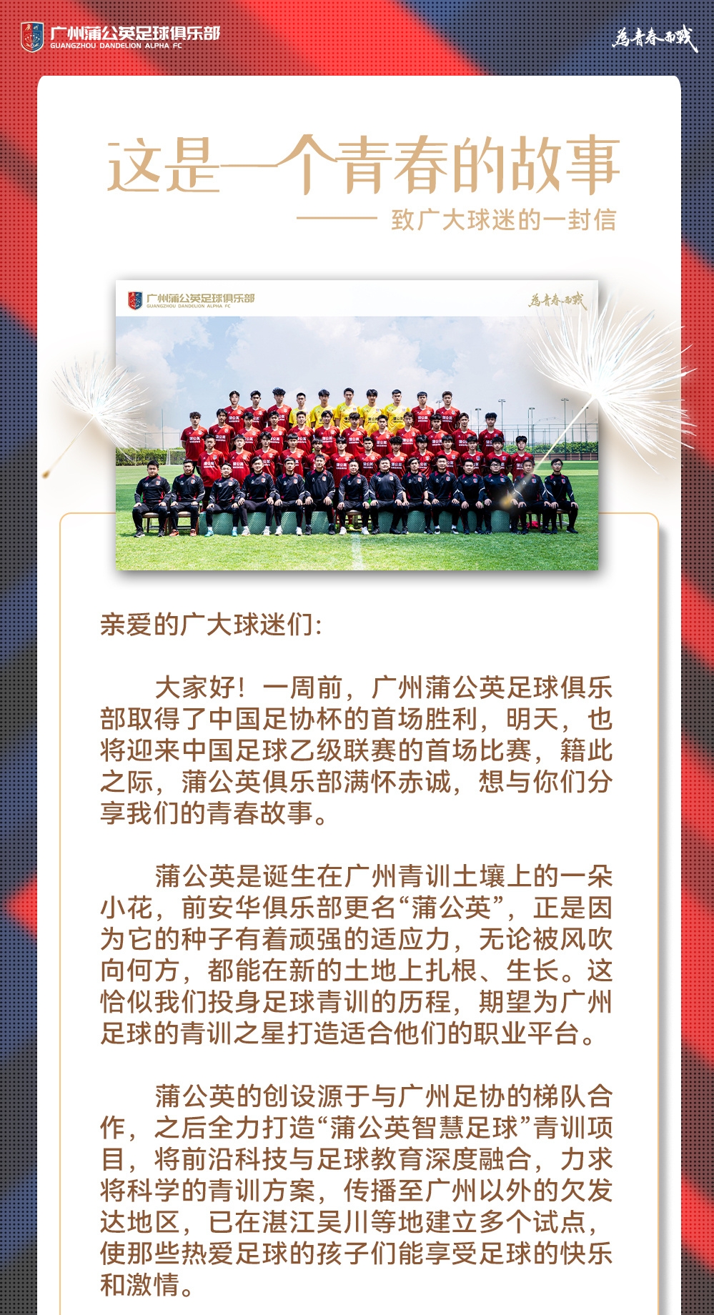 大家好!一周前,廣州蒲公英足球俱樂部取得了中國(guó)足協(xié)杯的首場(chǎng)勝利。明天,也將迎來中國(guó)足球乙級(jí)聯(lián)賽的首場(chǎng)比賽,籍此之際,蒲公英俱樂部滿懷赤誠(chéng),想與你們分享我們的青春故事。