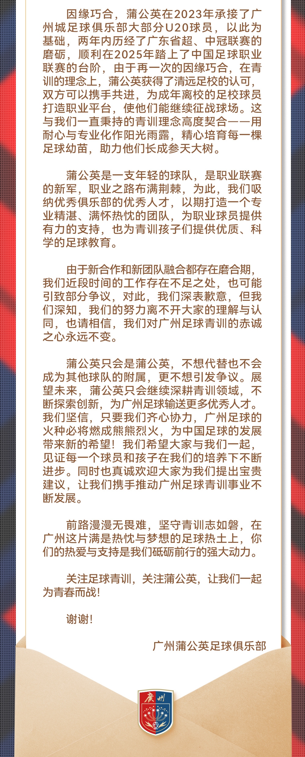 蒲公英只會(huì)是蒲公英,不想代替也不會(huì)成為其他球隊(duì)的附屬,更不想引發(fā)爭(zhēng)議。展望未來,蒲公英只會(huì)繼續(xù)深耕青訓(xùn)領(lǐng)域,不斷探索創(chuàng)新,為廣州足球輸送更多優(yōu)秀人才。我們堅(jiān)信,只要我們齊心協(xié)力,廣州足球的火種必將燃成熊熊烈火,為中國(guó)足球的發(fā)展帶來新的希望!我們希望大家與我們一起,見證每一個(gè)球員和孩子在我們的培養(yǎng)下不斷進(jìn)步,同時(shí)也真誠(chéng)歡迎大家為我們提出寶貴建議,讓我們攜手推動(dòng)廣州足球青訓(xùn)事業(yè)不斷發(fā)展。