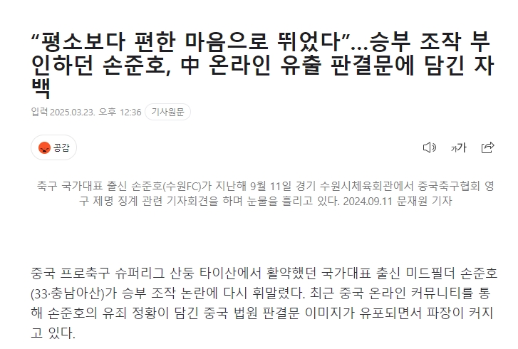 韓媒標(biāo)題:“我比平時更放松心態(tài)比賽”孫準(zhǔn)浩否認(rèn)操縱比賽,但在中國網(wǎng)絡(luò)上泄露的判決書中承認(rèn)了這一罪行。