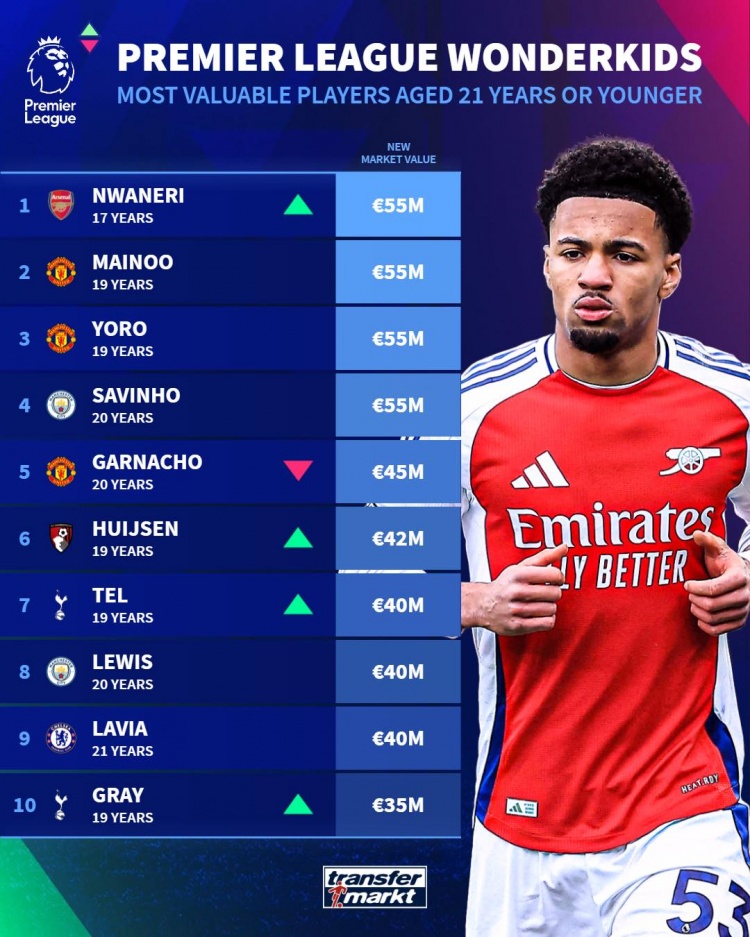 3月19日訊 德國轉(zhuǎn)會市場更新了英超U21球員的最新身價,并列出身價榜單,恩瓦內(nèi)里、梅努、約羅、薩維尼奧5500萬歐并列居首。