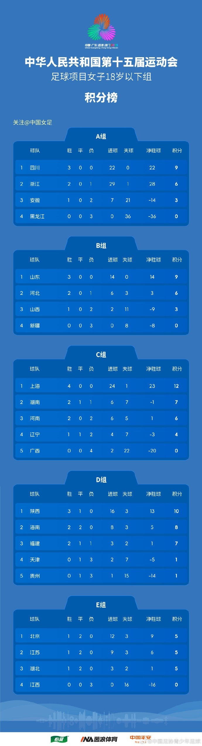 中華人民共和國(guó)第十五屆運(yùn)動(dòng)會(huì)足球項(xiàng)目女子18歲以下組資格賽(C組/D組)第5輪、(A組/B組/E組)第3輪賽果+積分榜 ??? 本文標(biāo)簽: 足球 中超 中國(guó)足球 轉(zhuǎn)載