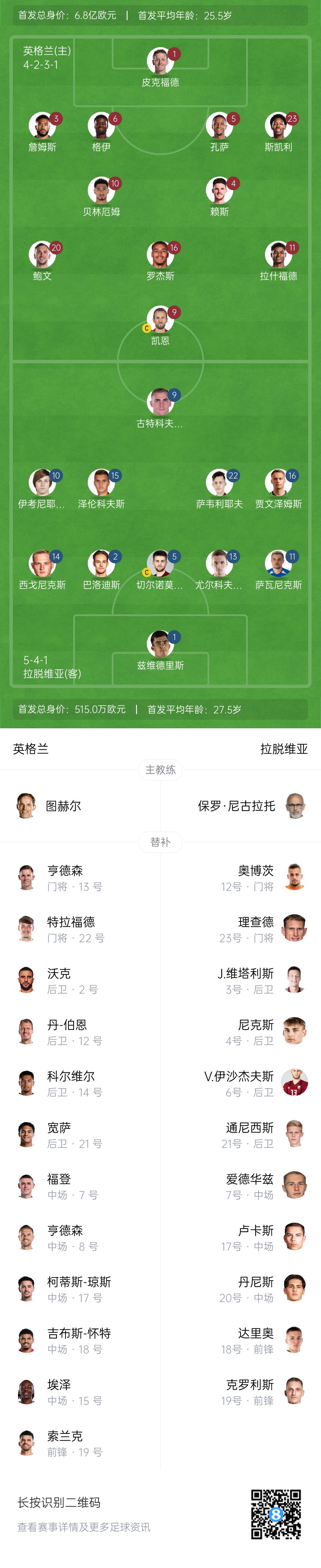 英格蘭首發(fā):1-皮克福德、3-詹姆斯、6-格伊、5-孔薩、23-劉易斯-斯凱利、4-賴斯、10-貝林厄姆、20-鮑文、16-羅杰斯、11-拉什福德、9-凱恩