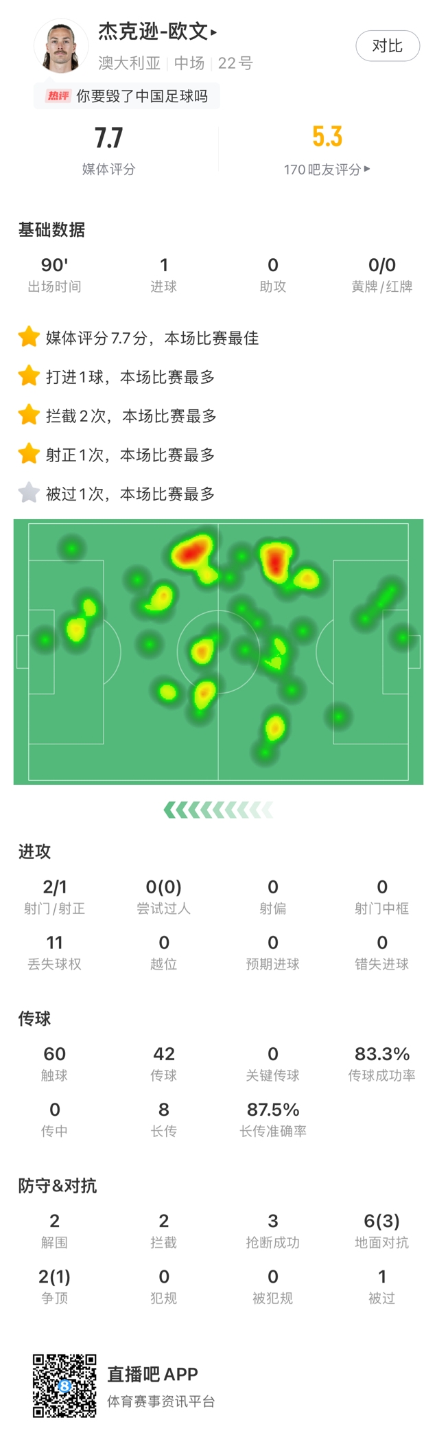 03月25日訊 世預(yù)賽亞洲區(qū)18強(qiáng)賽C組第8輪,國足主場0-2輸給澳大利亞,賽后杰克遜-歐文當(dāng)選全場最佳!歐文為澳大利亞打入了第一粒進(jìn)球:杰克遜-歐文本場數(shù)據(jù)↓ 本文標(biāo)簽: 足球 國家隊 中國男足 中國足球 澳大利亞