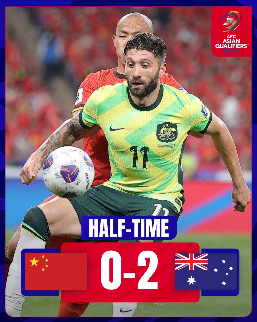 03月25日訊 世預(yù)賽亞洲區(qū)第三階段C組第8輪,中國(guó)男足暫0-2澳大利亞,中國(guó)隊(duì)下半場(chǎng)狀態(tài)不錯(cuò)。