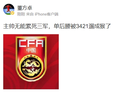 董方卓在社媒怒評國足:主帥無能累死三軍 單后腰被3421遛成猴了 ???。