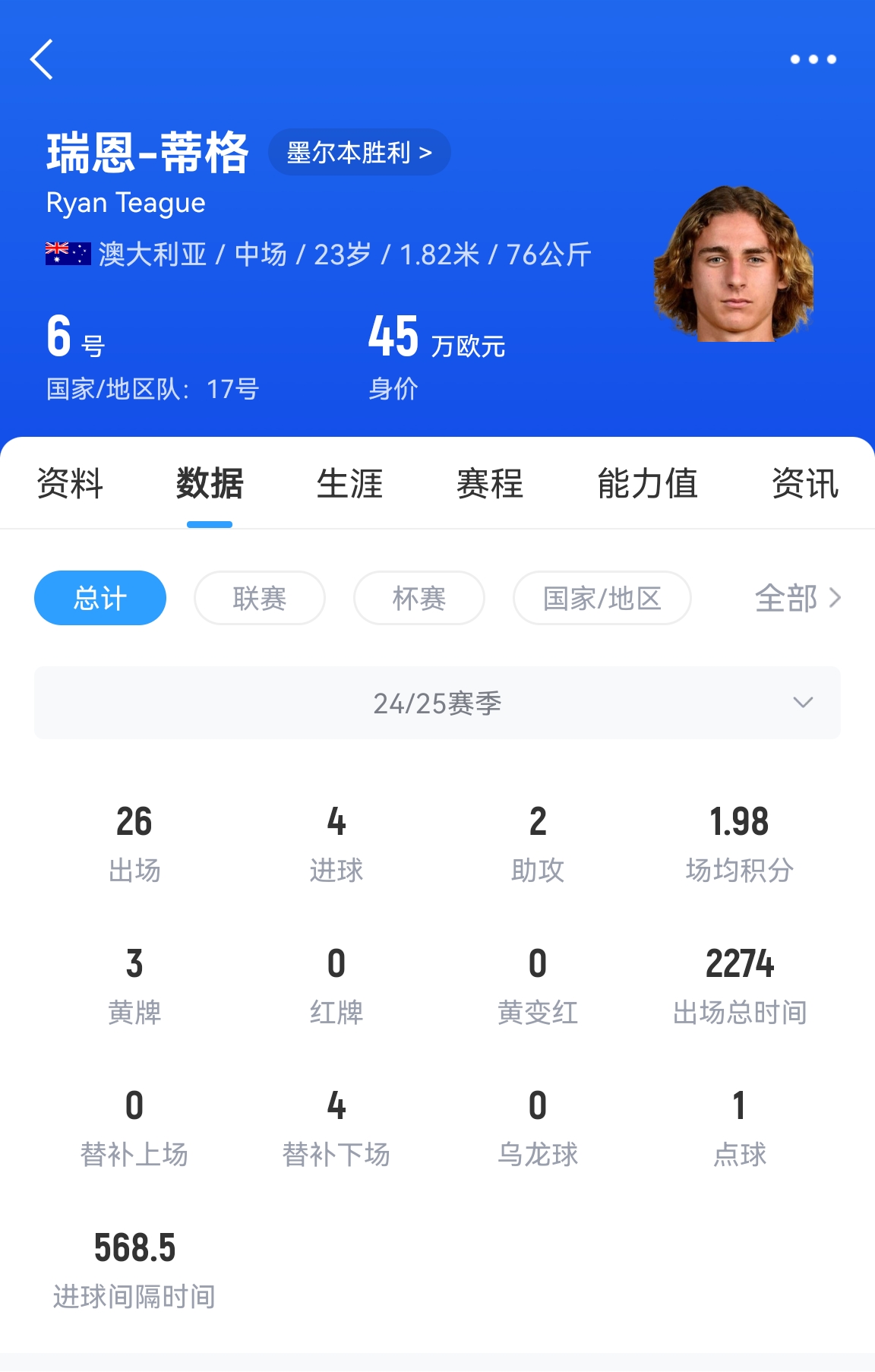 蒂格本賽季為墨爾本勝利出場26次打入4球2助攻,他的德轉(zhuǎn)身價為45萬歐元。