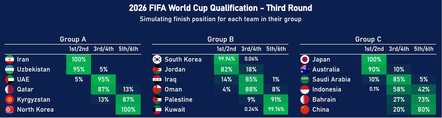 03月26日訊 數據機構Footy Rankings發(fā)布世預賽預測。其中中國隊20%排3/4(附加賽),80%排在5/6(無緣世界杯),而印尼58%概率獲得附加賽資格。 本文標簽: 足球 中國男足 中國足球 中超