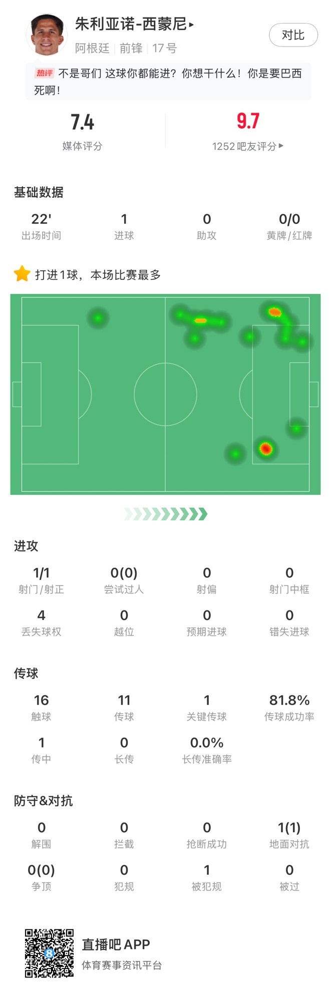 出場時間22分鐘,進(jìn)球1個