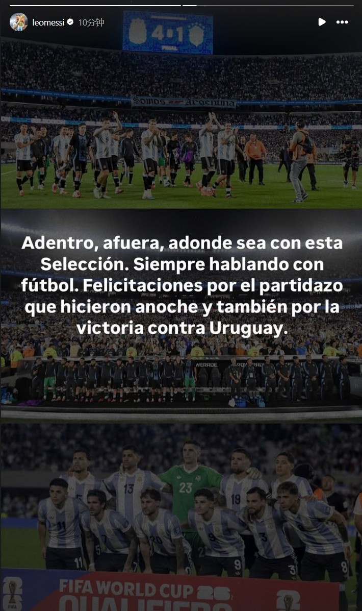 3月26日訊 梅西今天在Instagram發(fā)文,恭喜阿根廷隊(duì)擊敗了巴西。