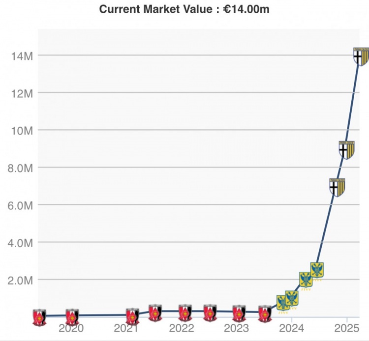 根據(jù)德轉顯示,鈴木彩艷在一年時間里身價上漲了6倍,去年3月22日德轉身價僅為200萬歐,那時他還效力于比甲球隊圣圖爾登。