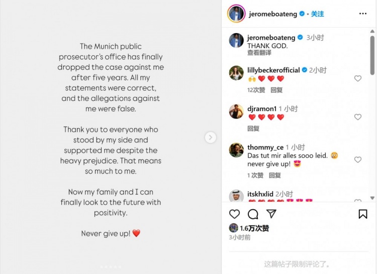 3月27日訊 博阿滕更新社媒,慶賀針對他的家暴指控被撤銷。博阿滕寫道:慕尼黑檢察院終于在五年后放棄了對我的指控。我所有的陳述都是正確的,對我的指控都是不實的。感謝所有在我遭受嚴重偏見時依然站在我身邊支持我的人。這對我意義重大。現(xiàn)在,我的家人和我終于可以帶著積極的心態(tài)面對未來。永不放棄!?? 本文標簽: 足球 德甲 拜仁慕尼黑 德國