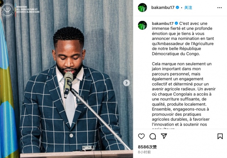 能夠被任命為民主剛果共和國(guó)農(nóng)業(yè)大使,我感到非常自豪和感動(dòng)。對(duì)我個(gè)人而言,這是一個(gè)非常重要的里程碑,同時(shí)這也是對(duì)我們國(guó)家發(fā)展光明農(nóng)業(yè)的一個(gè)堅(jiān)定承諾。希望未來(lái),每一個(gè)民主剛果人都能自給自足,獲得高質(zhì)量的本地生產(chǎn)食物。