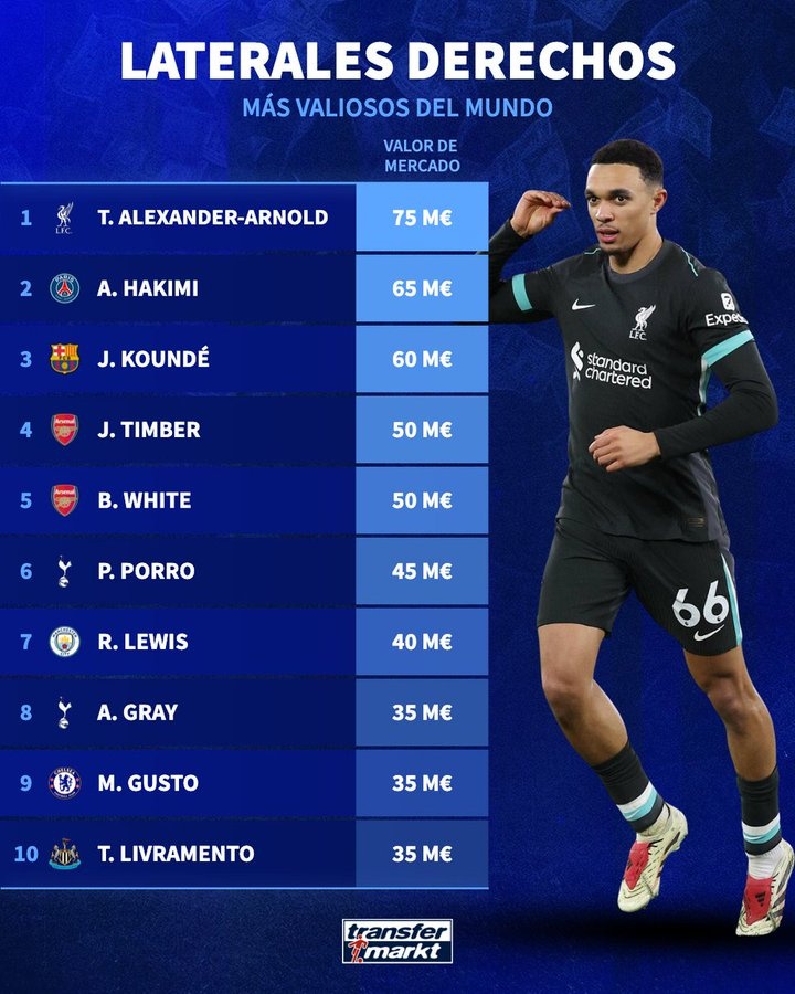 3月28日訊 媒體盛傳,阿諾德即將自由身轉(zhuǎn)會(huì)加盟皇馬。德國(guó)轉(zhuǎn)會(huì)市場(chǎng)今日列出右后衛(wèi)球員身價(jià)排名,阿諾德7500萬(wàn)歐元第一。
