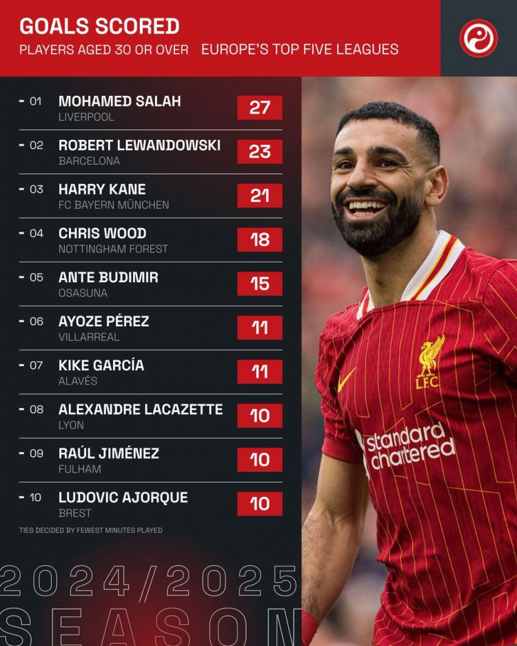 本賽季五大聯(lián)賽30歲及以上球員聯(lián)賽進(jìn)球榜: