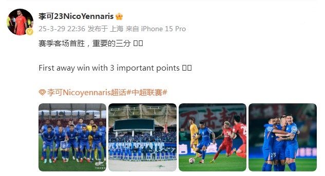 3月29日訊 北京時間今晚結(jié)束的中超第3輪,上海申花3-1逆轉(zhuǎn)河南隊,開局2勝1平積7分。賽后,申花球員李可更新社交媒體,曬出了比賽圖片。李可用中英文寫道:“賽季客場首勝,重要的三分!”本場比賽,李可和吳曦搭檔雙中場,并打滿了全場,此前李可也入選了3月份的國家隊名單。 本文標(biāo)簽: 足球 中超 中國足球 上海申花