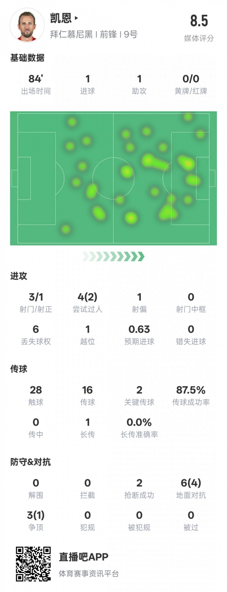 3月30日訊 德甲第27輪,拜仁對陣圣保利,凱恩首發(fā)出戰(zhàn),傳射建功,還送出2次關(guān)鍵傳球,評分8.5。凱恩本場比賽數(shù)據(jù)如下:進球1助攻1射門3射正1過人4過人成功2射偏1丟失球權(quán)6越位1觸球28傳球16關(guān)鍵傳球2傳球成功率87.5%長傳1長傳準確率0%搶斷2地面對抗6地面對抗成功4爭頂3爭頂成功1 本文標簽: 足球 德甲 拜仁慕尼黑 凱恩
