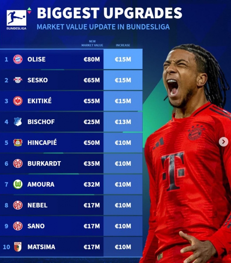 3月30日訊 《轉會市場》在此前更新了德甲球員身價,并列出了身價升值幅度最大情況,奧利塞等3人領銜。