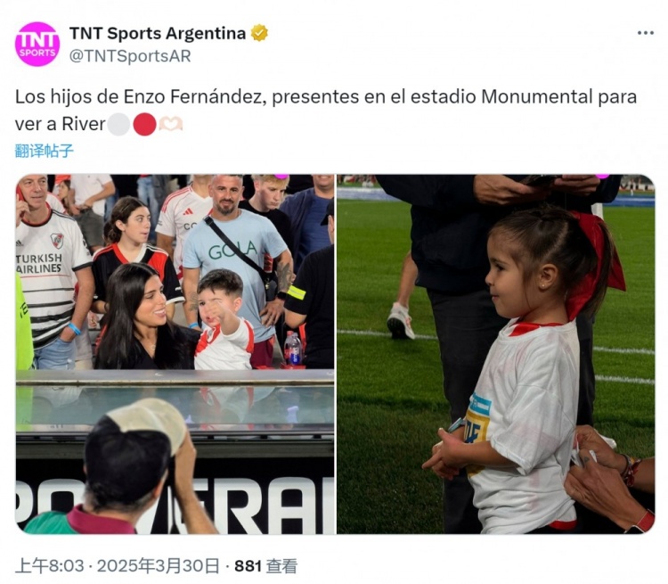 3月30日訊 河床對陣羅薩里奧中央的比賽正在進行中,恩佐-費爾南德斯的女友瓦倫蒂娜現(xiàn)場觀看比賽。瓦倫蒂娜帶著孩子們來到紀念碑球場,現(xiàn)場觀看河床隊的比賽。恩佐出身于河床青訓,他與瓦倫蒂娜去年曾分手,兩人今年1月份宣布復合。 本文標簽: 足球 英超 切爾西 阿超