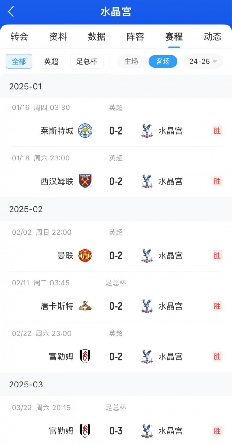 3月30日訊 水晶宮在本輪足總杯客場3-0完勝富勒姆,延續(xù)了近期的出色表現(xiàn)。OPTA數(shù)據(jù)統(tǒng)計顯示,水晶宮各項賽事客場已取得6連勝并且0丟球,也是英格蘭頂級聯(lián)賽歷史首支達成此成就的球隊。 本文標簽: 足球 英超 水晶宮 富勒姆