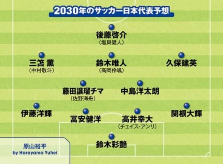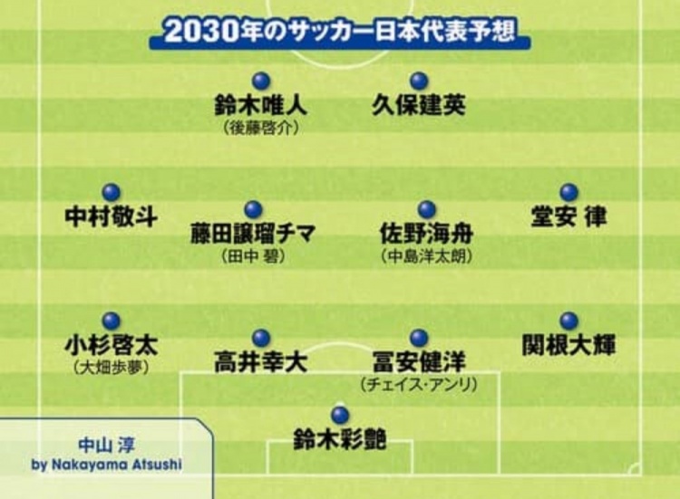 3月30日訊 據(jù)日媒Sportiva報(bào)道,近日該媒體開設(shè)專欄,開始對(duì)2030年世界杯日本隊(duì)首發(fā)陣容預(yù)測(cè),有部分日本國(guó)內(nèi)的自由撰稿人投稿對(duì)首發(fā)進(jìn)行預(yù)測(cè)。以上撰稿人預(yù)測(cè)的陣容中,基本都是本期日本國(guó)家隊(duì)陣中的年輕球員,并結(jié)合部分現(xiàn)役U22國(guó)家隊(duì)、U20國(guó)家隊(duì)球員等組合而成。
