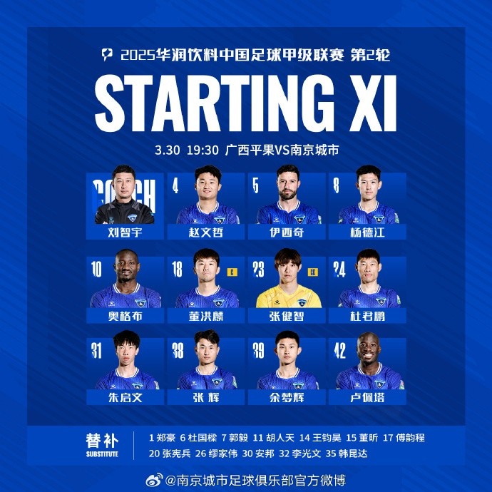 南京城市2025賽季客場首戰(zhàn)首發(fā)陣容!