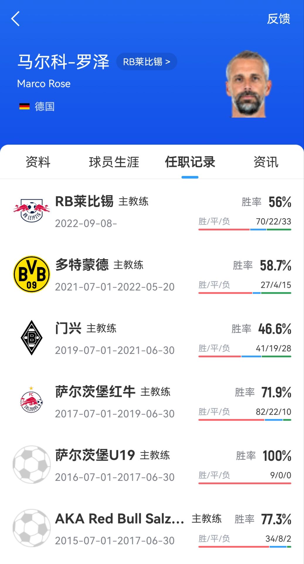 現(xiàn)年48歲的羅澤在2022年9月成為RB萊比錫萊比錫主帥,帶隊(duì)?wèi)?zhàn)績(jī)127場(chǎng)72勝22平33負(fù)。在羅澤執(zhí)教的第一個(gè)賽季,RB萊比錫就拿下了德國(guó)杯冠軍,并在2023/24賽季3-0完勝拜仁,拿到了德超杯冠軍。