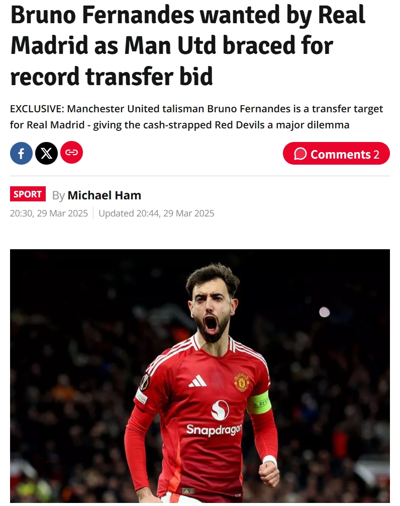 據(jù)英國《每日星報(bào)》獨(dú)家消息,皇馬可能考慮向曼聯(lián)支付9000萬英鎊的轉(zhuǎn)會(huì)費(fèi),以挖角B費(fèi)。