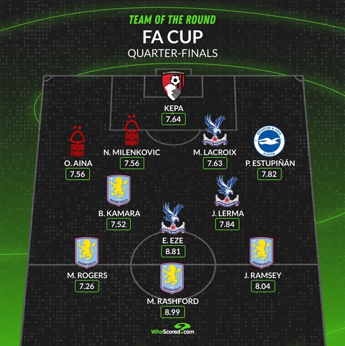 3月31日訊 足總杯八強(qiáng)戰(zhàn)已經(jīng)完賽,whoscored也列出了本輪評分最佳陣容,維拉4將在列。