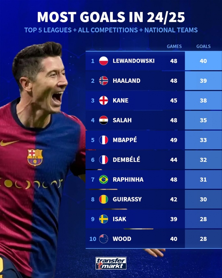 3月31日訊 德國轉(zhuǎn)會市場統(tǒng)計了本賽季五大聯(lián)賽球員所有賽事的進(jìn)球數(shù)量,并列出榜單,36歲萊萬以40球居首,哈蘭德、凱恩排名二三位。