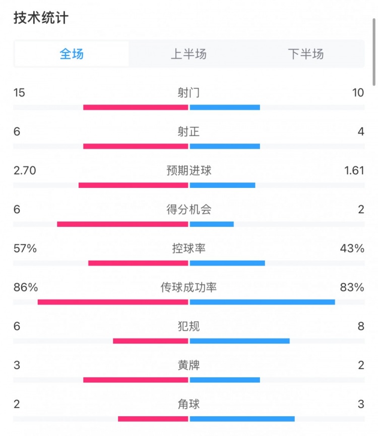 1月26日訊 英超第23輪,曼城3-1切爾西。兩隊(duì)全場(chǎng)數(shù)據(jù):(曼城在前)射門:15-10射正:6-4預(yù)期進(jìn)球:2.70-1.61得分機(jī)會(huì):6-2控球率:57%-43%傳球成功率:86%-83%犯規(guī):6-8黃牌:3-2角球:2-3 本文標(biāo)簽: 足球 英超 切爾西 曼城