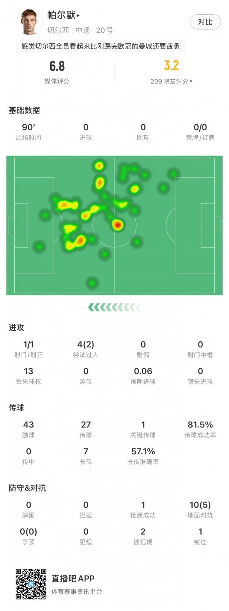 1月26日訊 英超第23輪,曼城3-1切爾西。帕爾默本場數(shù)據(jù):43次觸球27次傳球21次成功傳球成功率81%1次關(guān)鍵傳球7次長傳4次成功1次射門4次過人2次成功10次地面對抗贏得5次13次丟失球權(quán)2次被犯規(guī)1次搶斷1次被過 本文標(biāo)簽: 足球 英超 切爾西