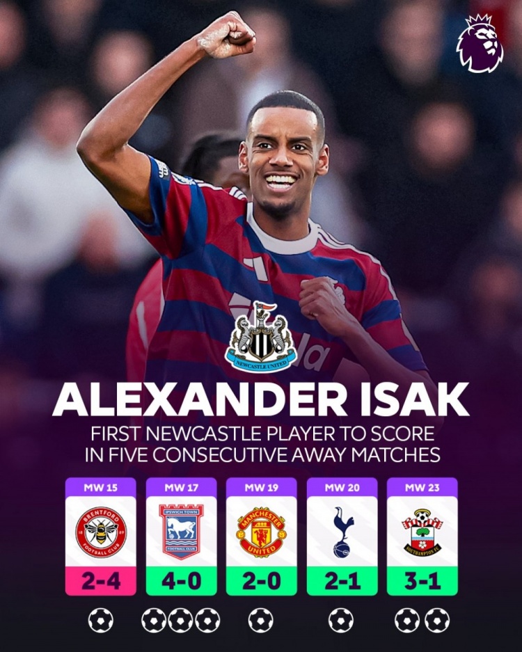 根據(jù)統(tǒng)計,伊薩克成為了紐卡隊史上第一位連續(xù)5個英超客場比賽取得進球的球員。