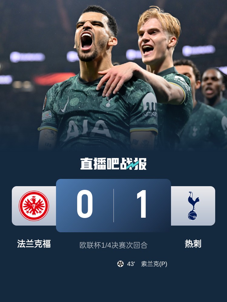 索蘭克點(diǎn)射建功,最終熱刺1-0客勝法蘭克福,總比分2-1晉級四強(qiáng)。