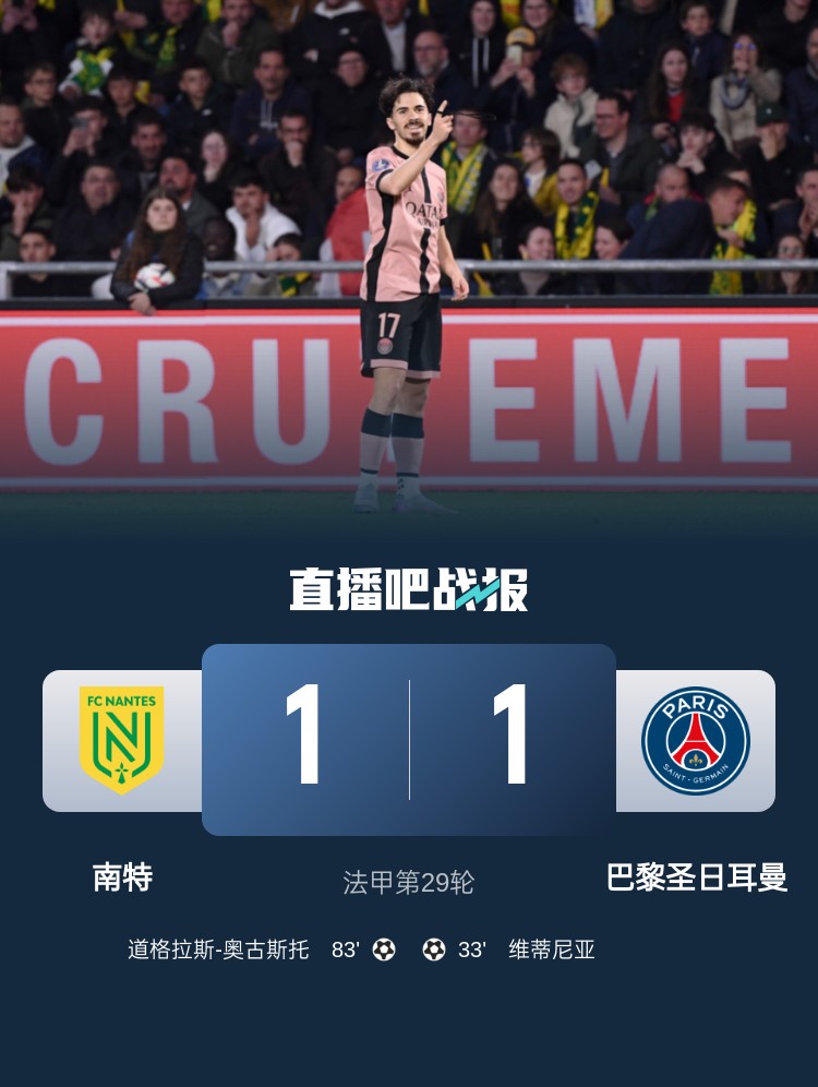 法甲第29輪,巴黎1-1戰(zhàn)平南特。上半場,維蒂尼亞幫助巴黎取得領先;下半場,道格拉斯-奧古斯托幫助南特扳平。